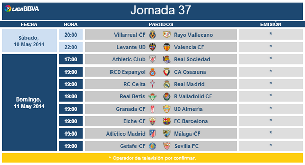 HORARIOS DE LA JORNADA 37 LIGA BBVA.