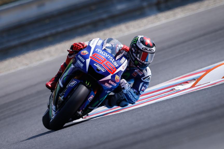 Jorge Lorenzo, Movistar Yamaha MotoGP, Brno FP2Percances aparte, en Brno se mantuvo el duelo que tuvieron en Indianápolis Lorenzo y Márquez, que fueron los dos más rápidos de la jornada, separados únicamente por 14 milésimas, con el balear haciendo valer su crono de la primera tanda.