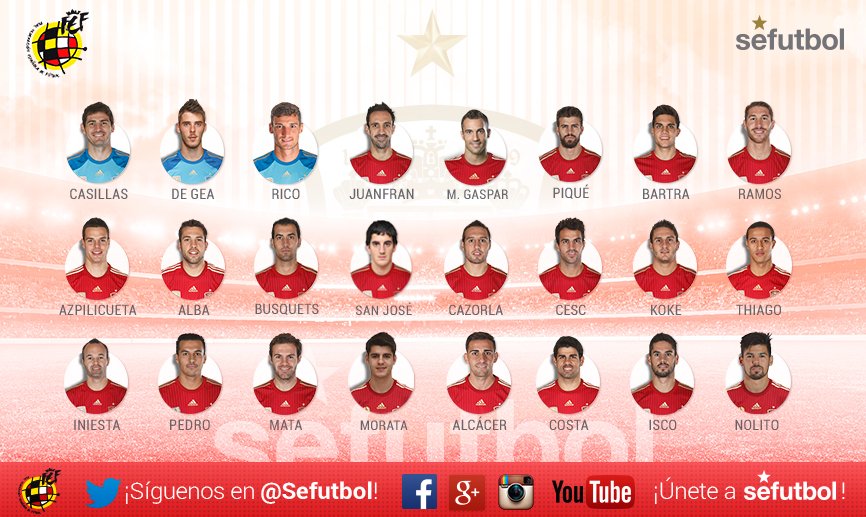 La lista de convocados la forman: Iker Casillas (Oporto), David de Gea (Manchester United), Sergio Rico (Sevilla),Marc Bartra (Barcelona), Juanfran Torres (Atlético Madrid), Sergio Ramos (Real Madrid), Jordi Alba (Barcelona), Gerard Piqué (Barcelona), César Azpilicueta (Chelsea), Mario Gaspar (Villarreal), Sergio Busquets (Barcelona), Mikel San José (Athletic), Isco Alarcón (Real Madrid), Cesc Fábregas (Chelsea), Santi Cazorla (Arsenal), Thiago Alcántara (Bayern), Juan Mata (Manchester United), Koke (Atlético), Iniesta (FC Barcelona), Pedro Rodríguez (Chelsea), Paco Alcácer (Valencia), Álvaro Morata (Juventus), Nolito (Celta) y Diego Costa (Chelsea).