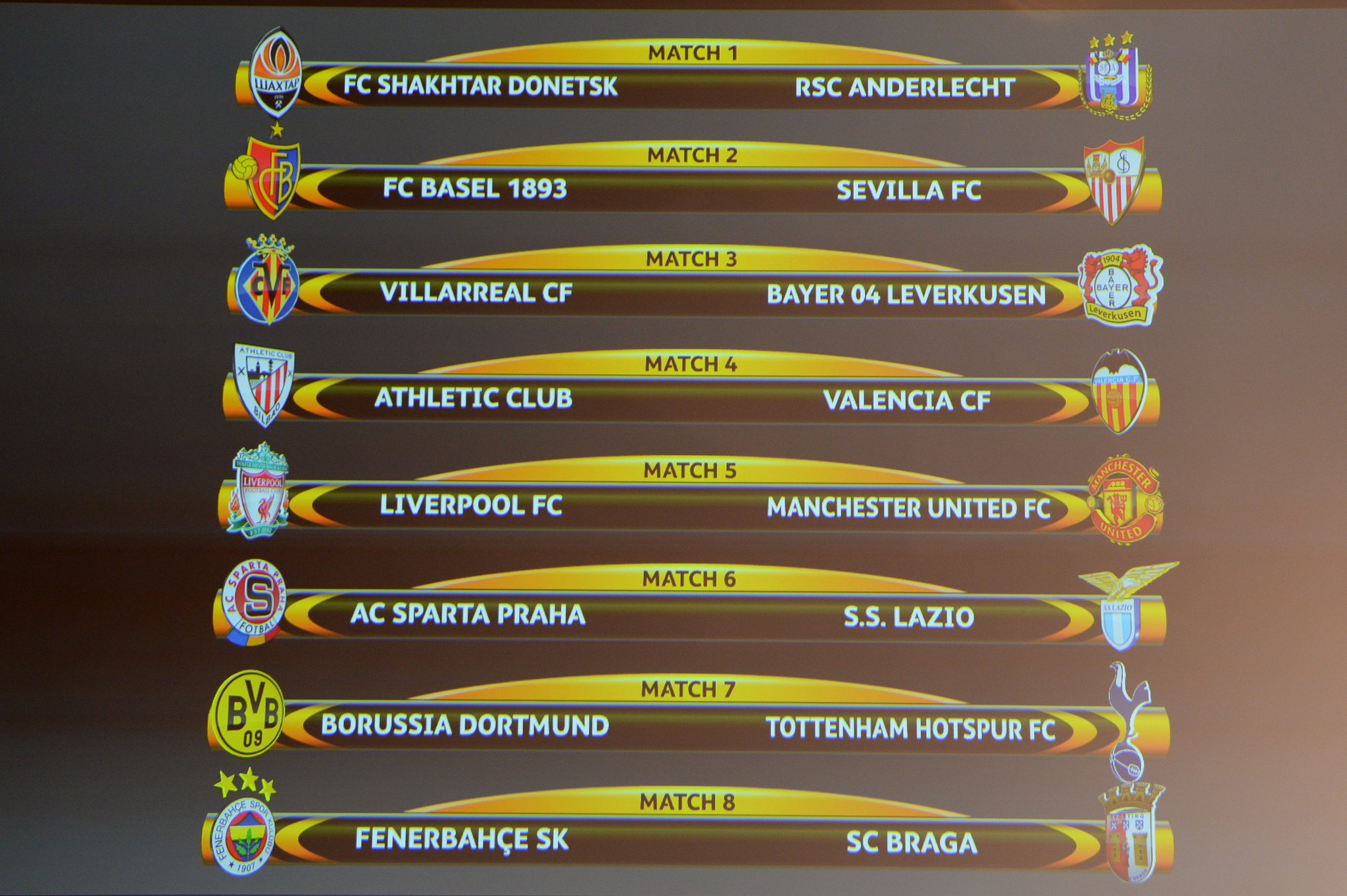 Los partidos de ida se jugarán el 10 de marzo y los de vuelta tendrán lugar el 17 del mismo mes. Tras un sorteo limpio, sin cabezas de serie y sin restricciones en cuanto a los equipos de un mismo país, el Athletic Club y el Valencia CF se verán las caras también en Europa, con la ida en San Mamés y la vuelta en Mestalla, mientras que el Sevilla jugará la vuelta en casa y el Villarreal deberá afrontar el partido de vuelta lejos de El Madrigal.Como en el sorteo de los dieciseisavos de final, el exjugador Alexander Frei, embajador de la final de Basilea (Suiza) que tendrá lugar el 18 de mayo de 2016, fue el encargado de extraer las bolas que han deparado la suerte de los equipos españoles. Las eliminatorias estrella sin presencia española serán el duelo inglés Liverpool-Manchester United y el duelo Borussia Dortmund-Tottenham Hotspur.