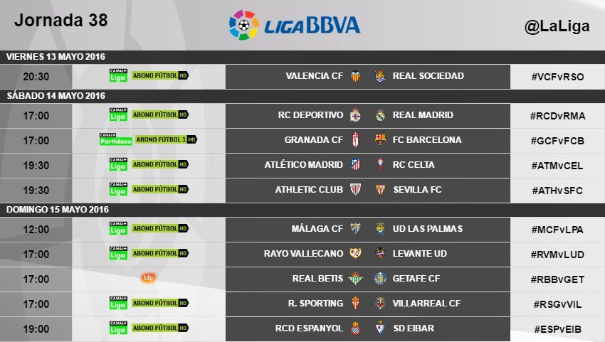 De esta forma, el próximo sábado habrá campeón de liga, que se decidirá entre Barcelona y Real Madrid. Los blaugranas visitarán Los Cármenes desde su posición de líderes, mientras que los blancos tendrán que vencer en Riazor a esa misma hora y que los de Luis Enrique no logren la victoria.Con el intrascendente Valencia - Real Sociedad adelantado al viernes (20.30), el puesto de acceso directo a Europa League se disputará el sábado a las 19.00 horas, cerrando la parte alta de la tabla. El Celta, que visitará el Calderón, aventaja en un punto al Athletic Club, que recibirá al Sevilla.