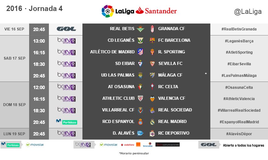LaLiga ha anunciado este viernes una modificación profunda de los horarios de la jornada 4 de la Liga Santander, desplazando, entre otros, los partidos del FC Barcelona en Leganés y del Atlético Madrid ante el Sporting.