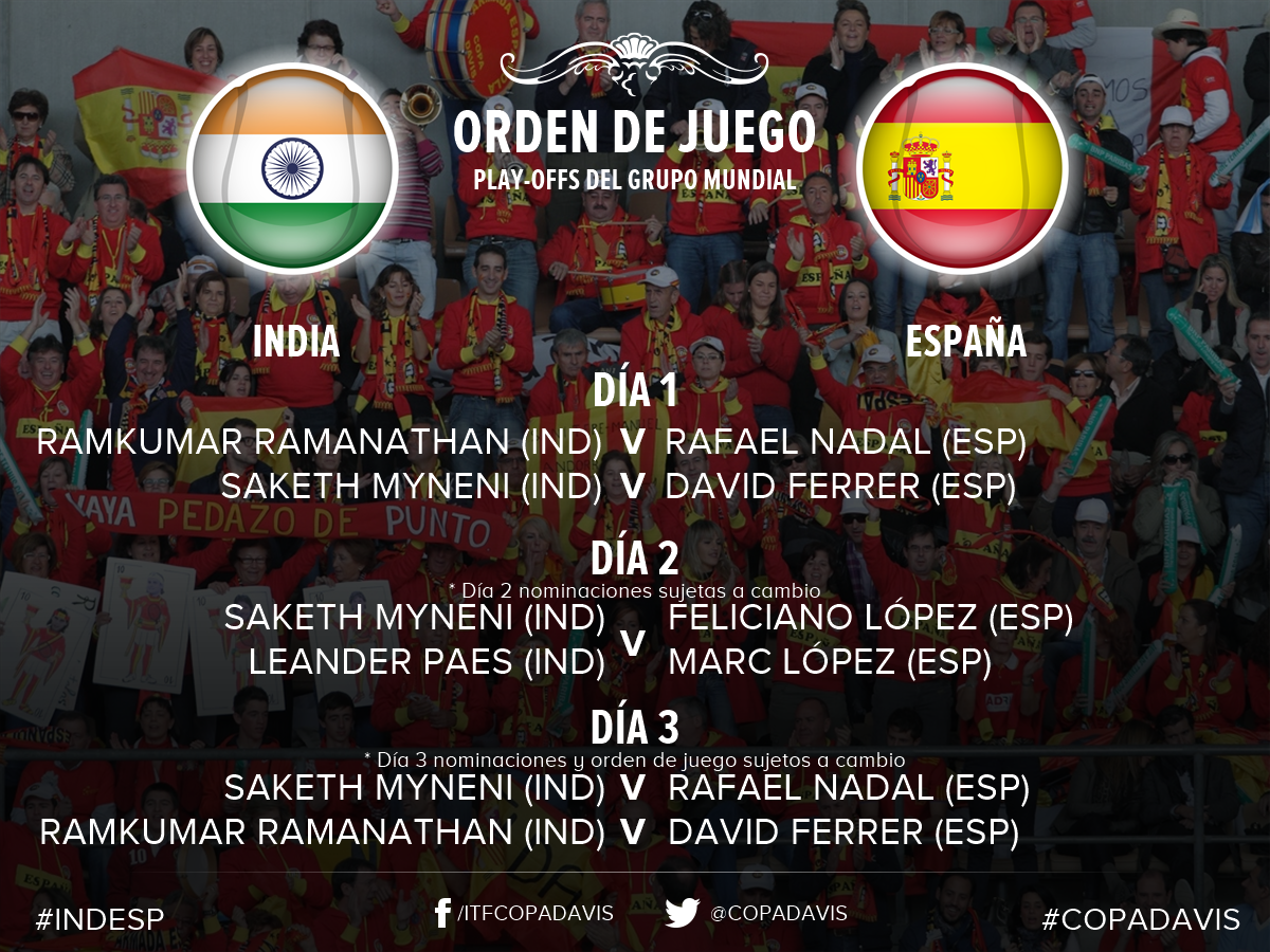 El balear espera imponer su favoritismo ante Ramkumar Ramanathan (21 años), número 203 del ranking mundial y que ha disputado diez partidos en toda su carrera en el circuito ATP.Posteriormente, Ferrer se medirá con Saketh Myneni, número uno del equipo indio, aunque también con rol de teórica víctima ante el alicantino. El jugador de 28 años ocupa el puesto 119 del ranking mundial y solo ha disputado tres encuentros ATP.