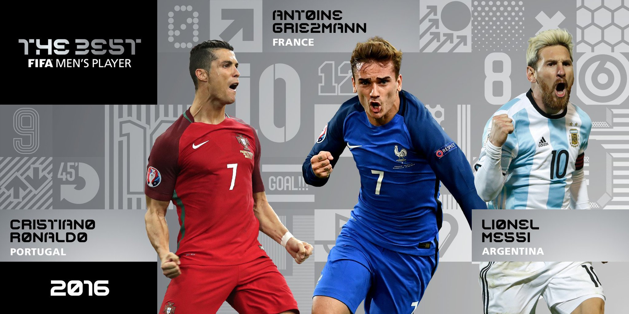 La terna la completa el delantero francés Antoine Griezmann, elegido Mejor Jugador de la Eurocopa de Francia donde lideró a su selección hasta la final marcando seis goles. El jugador del Atlético de Madrid también fue clave con su equipo alcanzando la final de la Liga de Campeones y marcando 22 goles en el torneo doméstico.