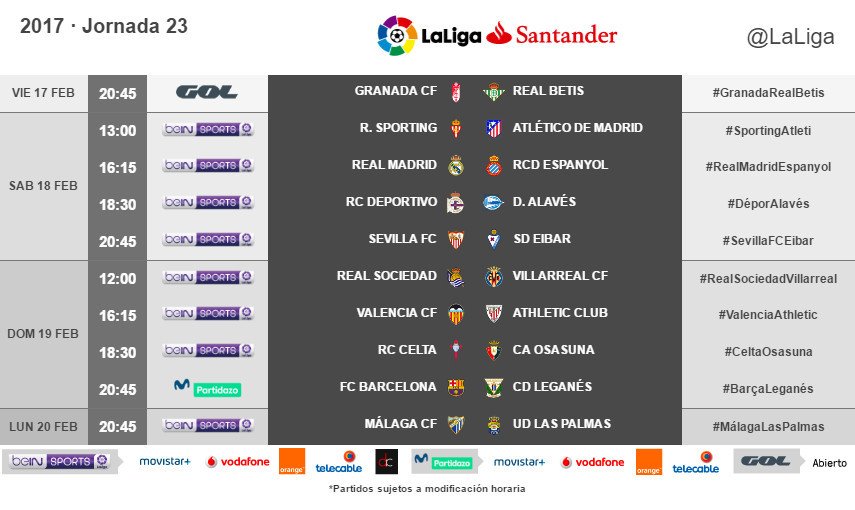 El Real Madrid recibirá al Espanyol el sábado 18 de febrero a las 16.15 horas, mientras que un día más tarde el FC Barcelona esperará en la Ciudad Condal al Leganés (20.45 horas), en partidos correspondientes a la vigésimo tercera jornada de LaLiga Santander, según los horarios confirmados este martes por LaLiga.Además, el Atlético de Madrid se desplazará el 18 hasta Asturias para medirse al Sporting de Gijón (13.00 horas) y el Sevilla, horas más tarde (20.45), recibirá al Eibar en el Ramón Sánchez Pizjuán.