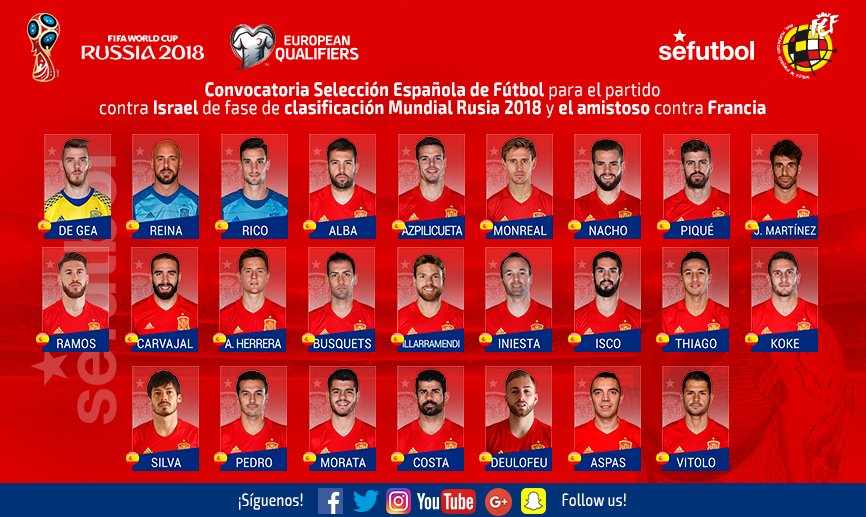 Además, regresan a la lista, tras perderse por lesión los dos los encuentros de noviembre ante Macedonia e Inglaterra, el defensa del Real Madrid Sergio Ramos y el central del FC Barcelona Gerard Piqué, así como el centrocampista Andrés Iniesta (FC Barcelona), el lateral Jordi Alba (FC Barcelona) y el delantero del Chelsea Diego Costa, que entró en la última convocatoria pero que tuvo que ser sustituido por Iago Aspas y abandonar la concentración por problemas musculares.