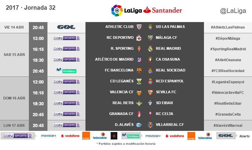 El Real Madrid visitará al Real Sporting de Gijón el sábado 15 de abril a las 16.15 horas y el FC Barcelona recibirá a la Real Sociedad el mismo día a las 20.45 horas, mientras que el Sevilla viajará a Mestalla para medirse al Valencia el domingo a las 16.15 horas, en partidos correspondientes a la trigésima segunda jornada de LaLiga Santander.El Athletic-Las Palmas, por su parte, abrirá la jornada liguera el viernes a las 20.45 horas en San Mamés y el duelo entre Alavés y Villarreal será el encargado de cerrarla el lunes a las 20.45 horas.