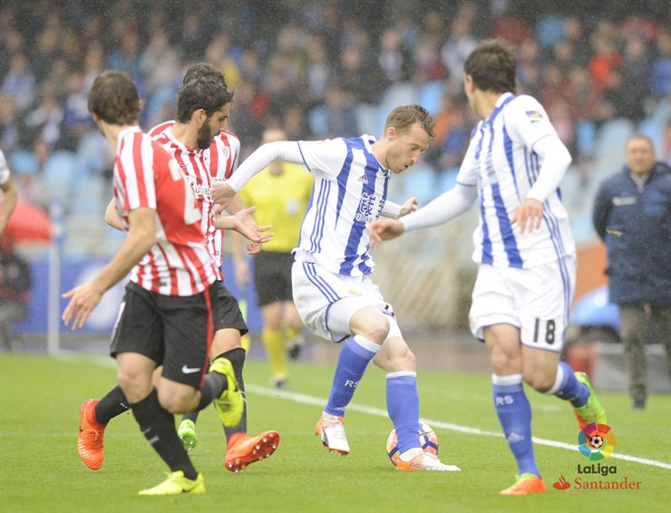 Por su parte, la Real Sociedad, que varió ligeramente su juego con respecto a los primeros 45 minutos, tuvo su ocasión más clara en un remate de cabeza de Raúl Navas que entró en la portería de Arrizabalaga, pero fue anulado por una supuesta falta del defensa txuri-urdin en el salto.