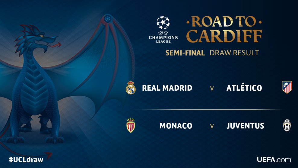 El Real Madrid y el Atlético de Madrid reeditarán la final de Milán del año pasado en la Liga de Campeones en las semifinales de este curso 2016-17, según deparó el sorteo celebrado este viernes en la sede de la UEFA en Nyon (Suiza), mientras que el Mónaco y la Juventus de Turín se cruzarán en la otra.