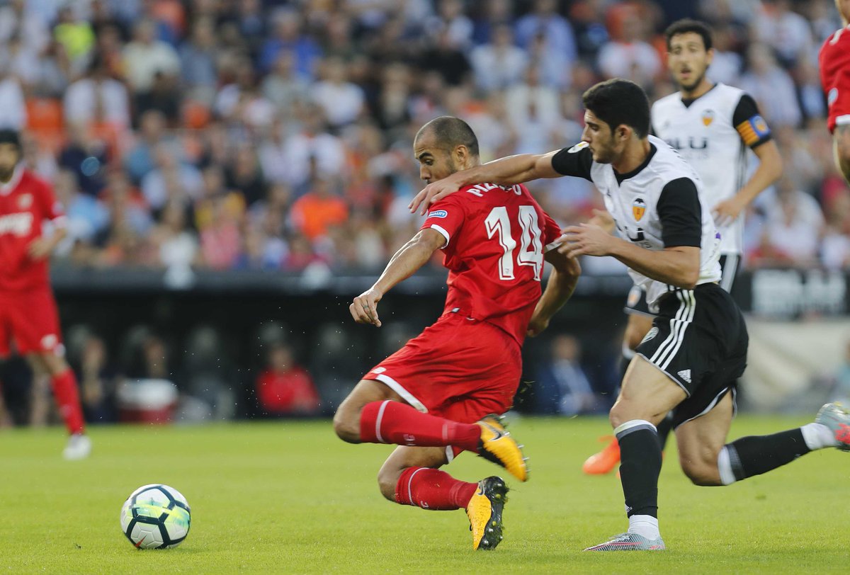 El Valencia de Marcelino García Toral salió con mucha más intensidad y hambre gracias al portugués Guedes, que marcó la diferencia al desbordar reiteradamente a la zaga hispalense. El equipo de Berizzo se cargó de faltas y amarillas durante la primera mitad y no pudo frenar al cuadro valencianista.