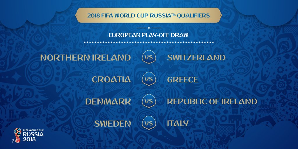 El sorteo de las repescas europeas, que repartirán los cuatro últimos billetes del continente para el Mundial de Rusia, ha deparado este martes los enfrentamientos Suecia-Italia, Croacia-Grecia, Dinamarca-Irlanda e Irlanda del Norte-Suiza.