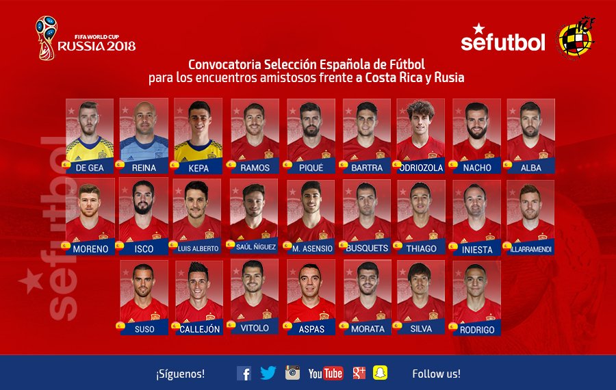 Además, Lopetegui volvió a confiar en el milanista Suso, que ya estuvo para los partidos ante Italia y Liechtenstein, y en el joven lateral de la Real Sociedad Álvaro Odriozola, y confirmó el regreso de uno de sus pilares, el delantero canario Vitolo, que se había perdido por lesión las dos anteriores. El centrocampista del FC Barcelona Andrés Iniesta, pese a que arrastra problemas físicos, también entró entre los 25 elegidos.