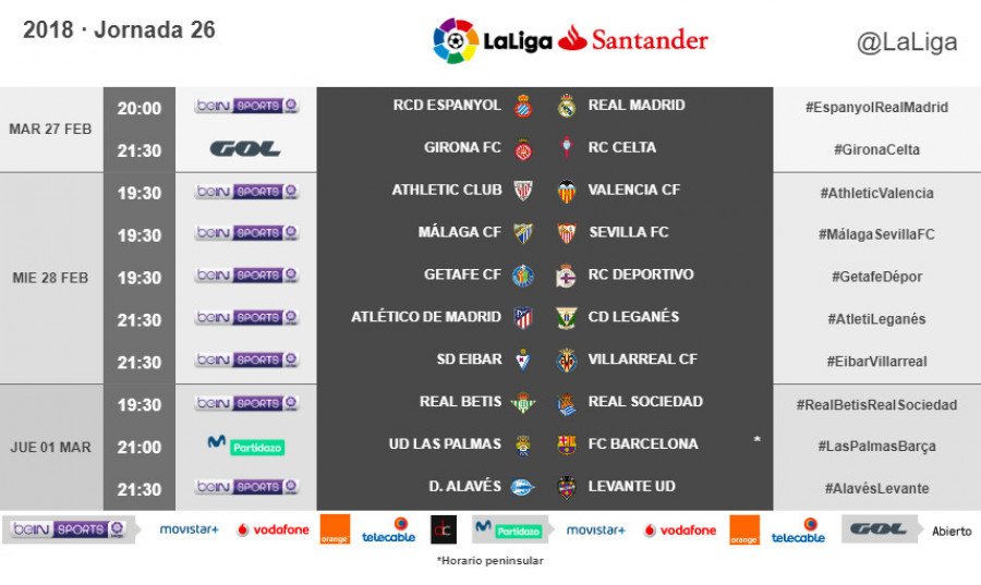 La visita del Real Madrid al Espanyol abrirá la vigésimo sexta jornada de La Liga Santander el martes 27 de febrero a partir de las 20 horas, mientras que el actual líder de la competición, el FC Barcelona, viajará hasta las islas para enfrentarse a Las Palmas el jueves 1 de marzo a las 21 horas.