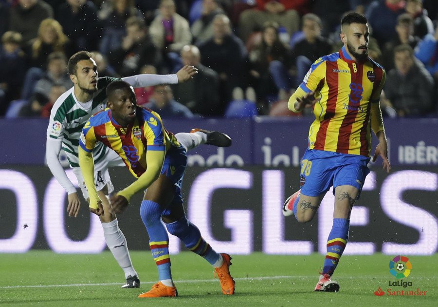 El cuadro local sobrevivió a un Eibar que no tuvo contundencia en ataque ni en defensa. El primer aviso de cada equipo fue bien claro. Kike mandó arriba un remate de cabeza al minuto y medio, mientras que Pazzini perdonó un gol cantado tras un triste despeje de Ramis en área pequeña. Mendilibar pidió más seriedad a su defensa, pero no encontró respuesta cuando poco después Roger encontró la red.Joan Jordán perdonó antes del descanso y, ya en el segundo tiempo, mandó el balón al larguero. El susto hizo replegar a un Levante que había reanudado la contienda con confianza, pero que sufrió el empate del recién entrado Charles. El equipo granota reaccionó de manera inmejorable con un gol de Boateng en el siguiente minuto que dejó la victoria en un Ciutat que cree más que nunca en la salvación.