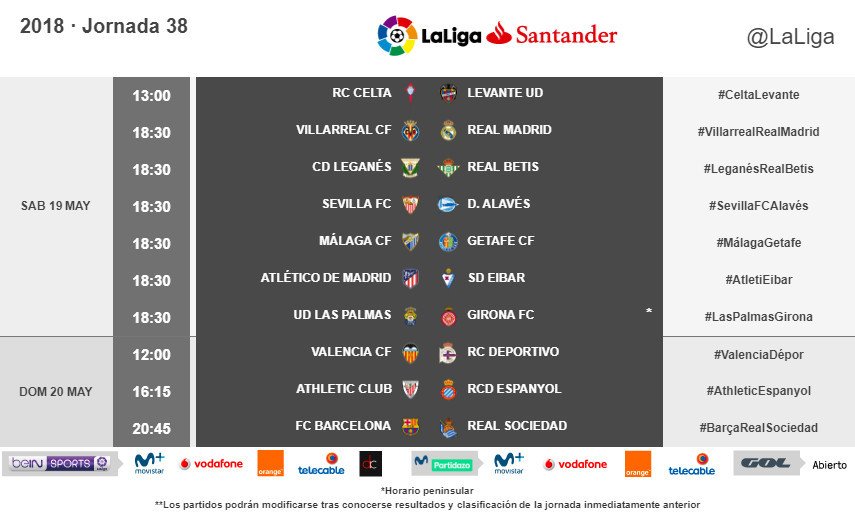 Además, en esta jornada 38 tanto el Real Madrid como el Atlético de Madrid jugarán a las 18.30 horas del sábado 19, el equipo blanco a domicilio frente al Villarreal y su vecino rojiblanco en casa ante el Eibar y tres días después de disputar la final de la Liga Europa ante el Marsella.