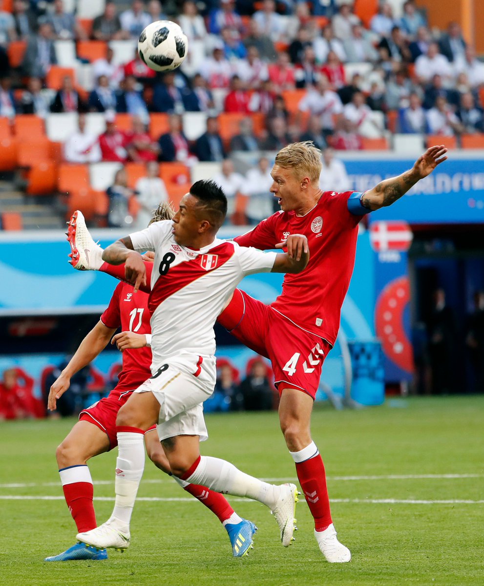 Simon Kjaer y Andreas Christensen tuvieron que multiplicarse en el centro de la zaga mientras Crhistian Eriksen, llamado a marcar diferencias, estuvo desaparecido. Dinamarca solo encontró el recurso de pelotas largas en busca de Nicolaj Jorgensen. Pudo dar el primer giro el choque al borde del intermedio propiciado por el VAR (videoarbitraje), que llamó la atención del árbitro gabonés Bakary Gassama para indicarle como penalti una falta de Yussuf Yurary Poulsen sobre Christian Cueva que había pasado por alto.