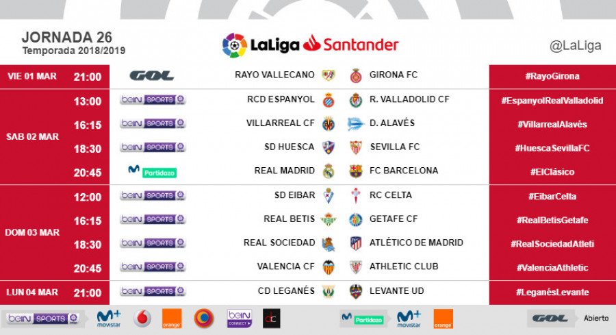 La vigésima sexta fecha liguera comenzará el viernes 1 de marzo con la disputa del Rayo Vallecano-Girona (21.00 horas) y finalizará el lunes 4 con el Leganés-Levante (21.00). El segundo de la tabla, el Atlético de Madrid, visitará Anoeta el domingo 3 a las 18.30 horas.